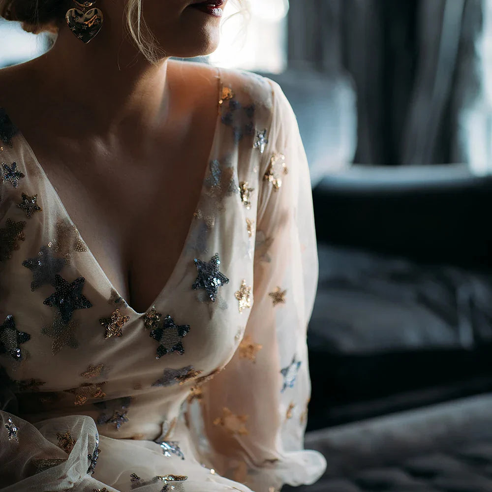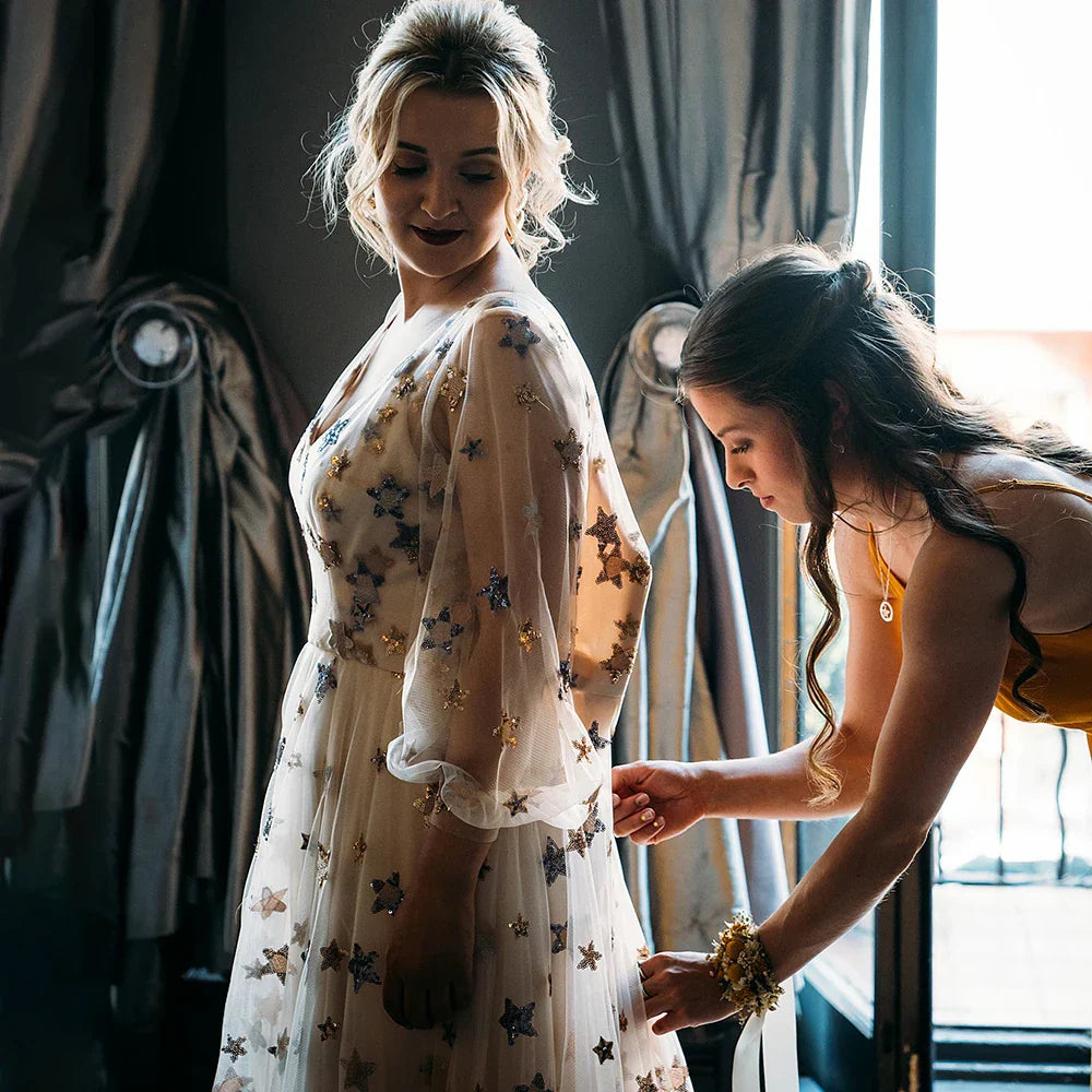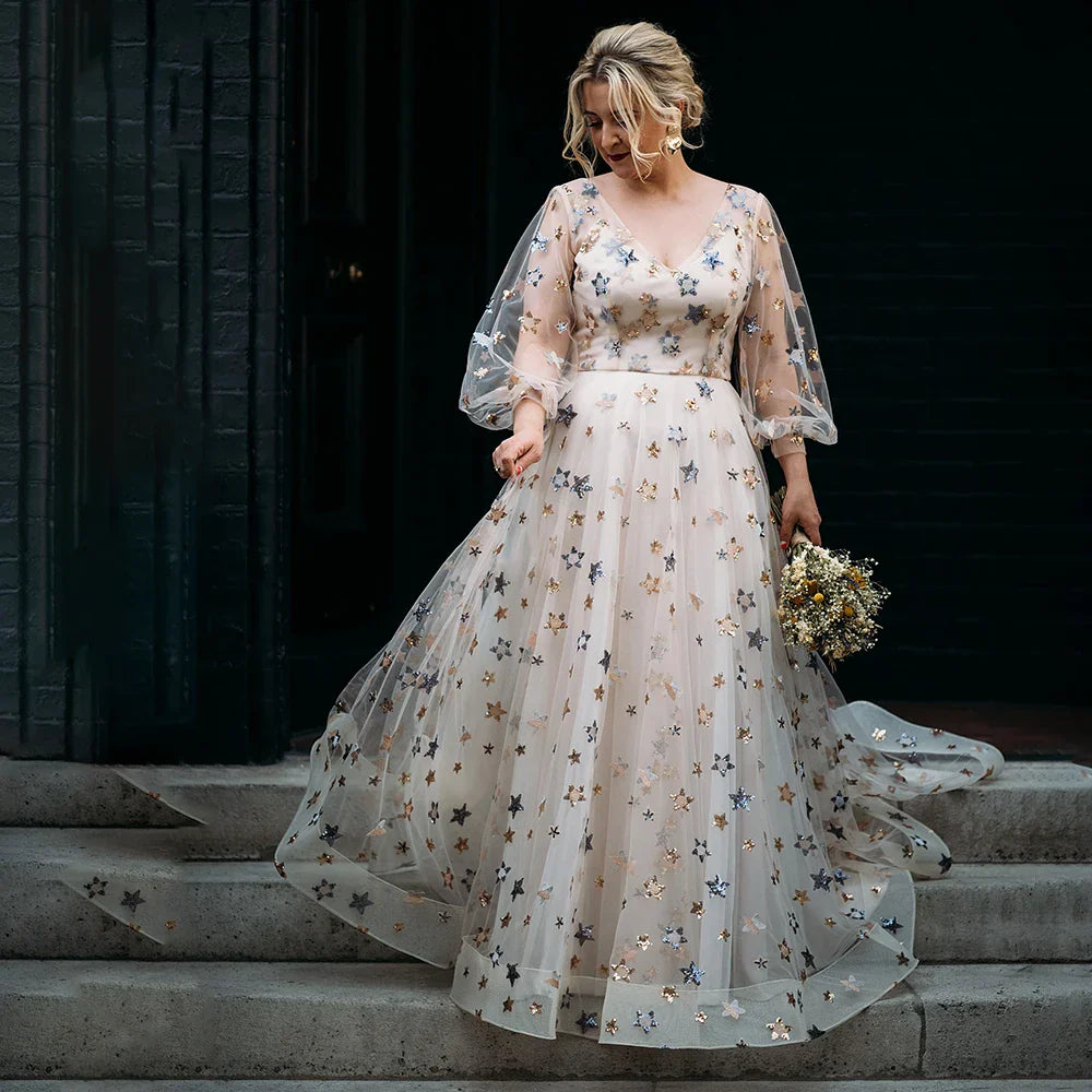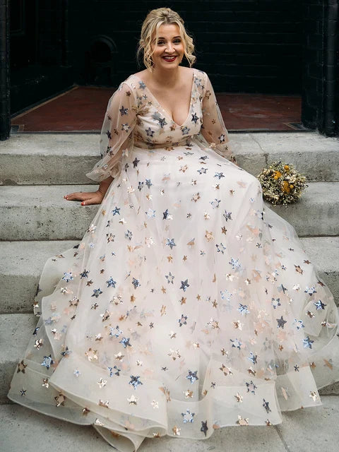Starry Tulle A-Line Plus Size Prom Dresses With Stitch Hem