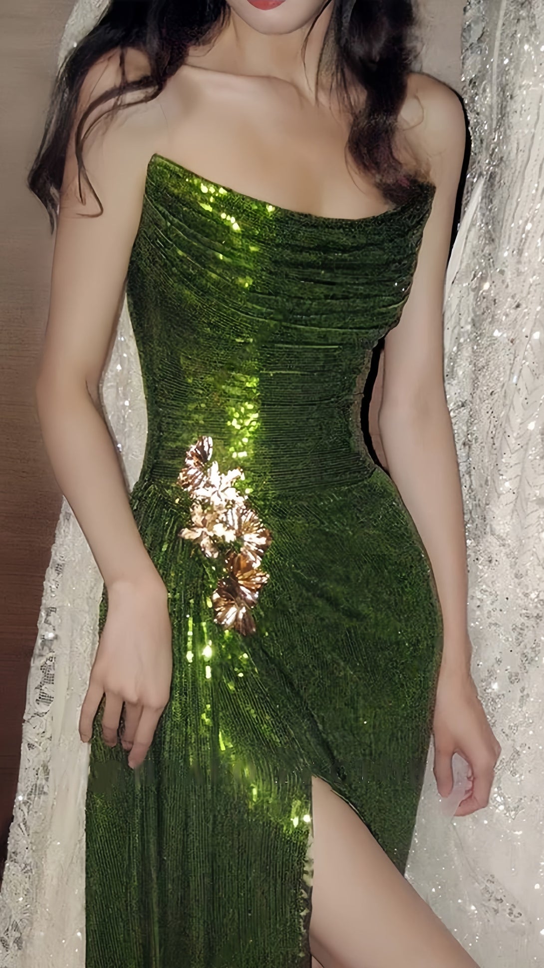 Strapless Green Sequin Prom Dress With Split, SSR3503
