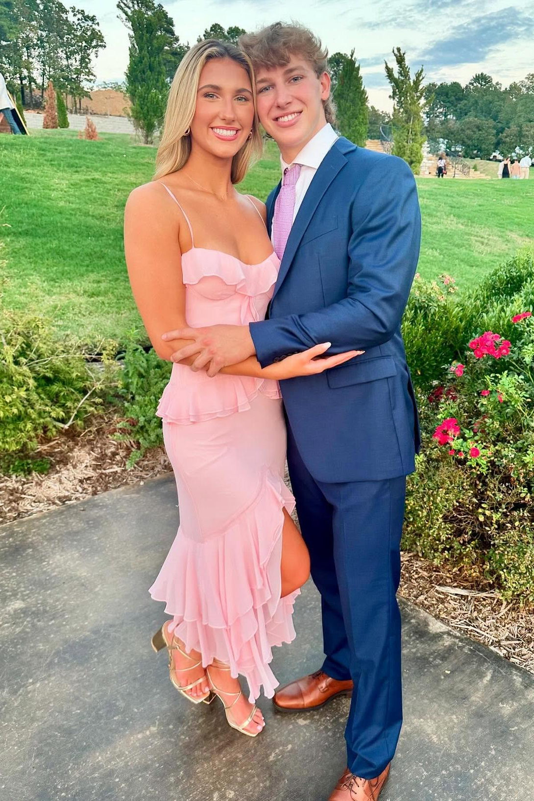 Straps Blue Chiffon Ruffle Slit Fitted Dress