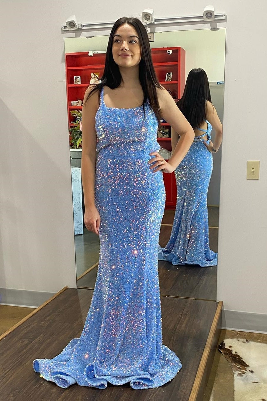 Straps Blue Sequin Mermaid Long Prom Dress with Cross Back