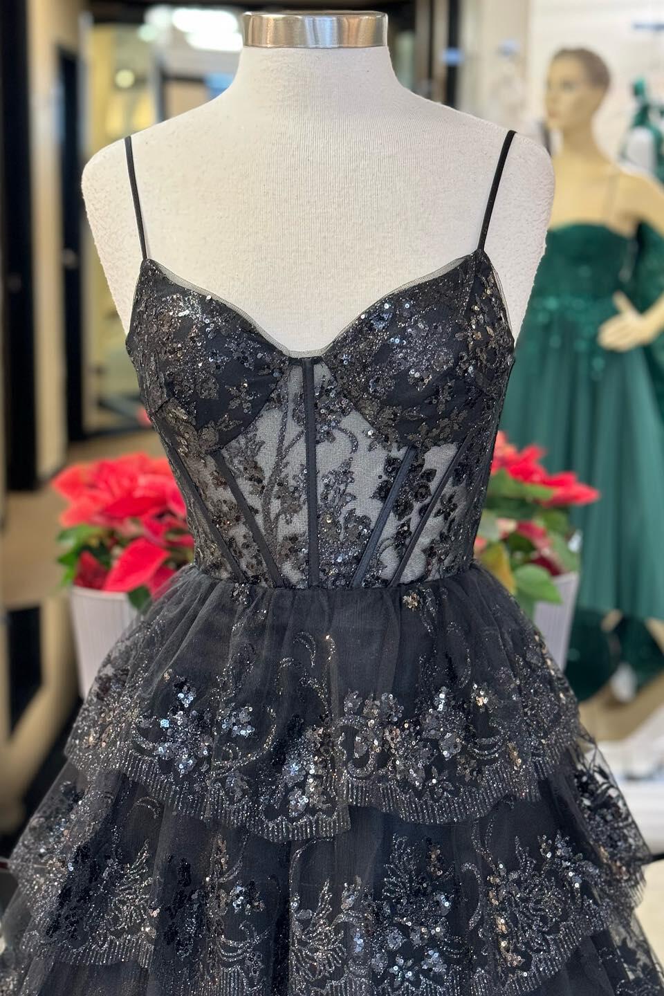 Straps Blue Sequin Tulle Ruffles Formal Dress