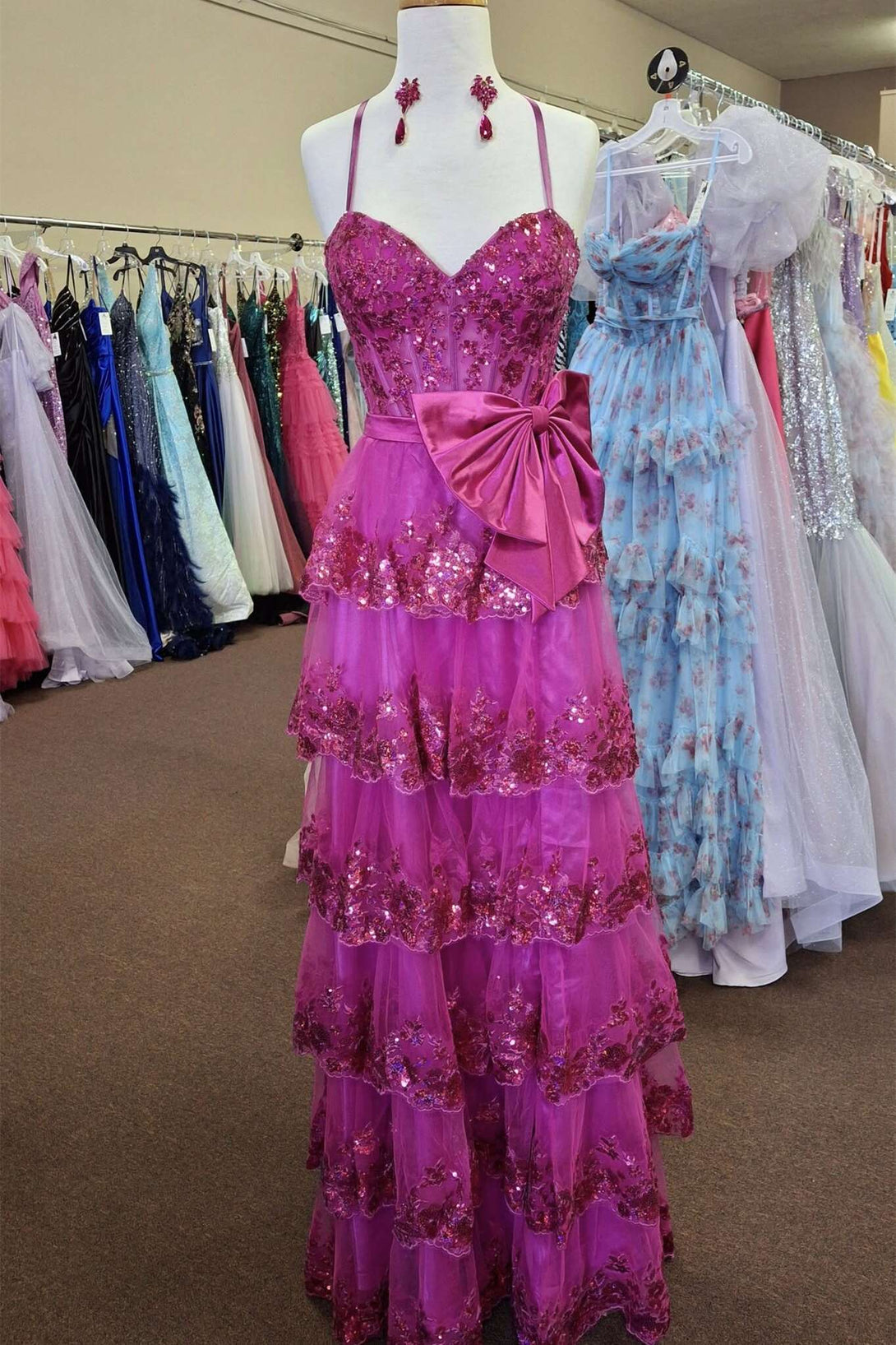 Straps Fuchsia Appliques A-line Ruffle Long Prom Dress