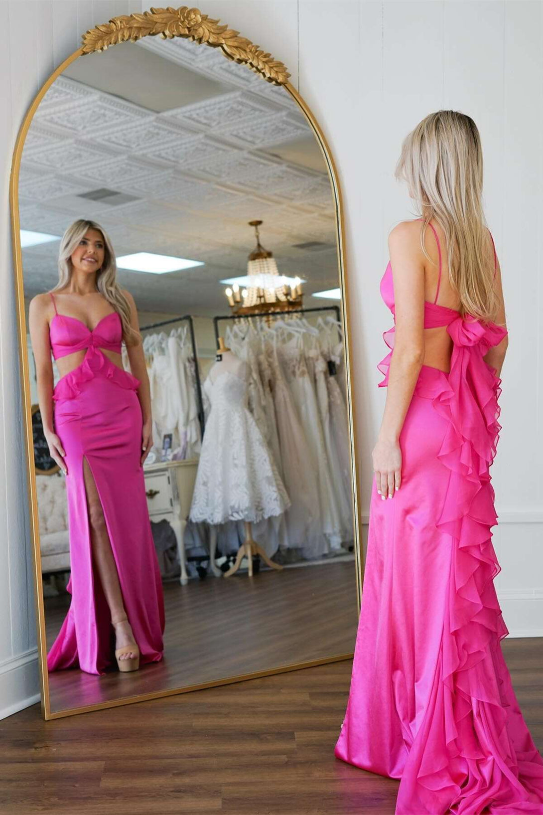 Straps Hot Pink Cutouts Ruffle Fitted Party Dress