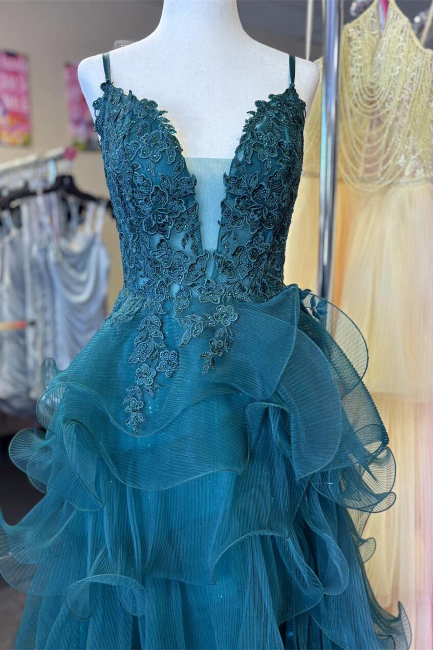 Straps Ink Blue Appliques Tulle Ruffles Long Formal Dress