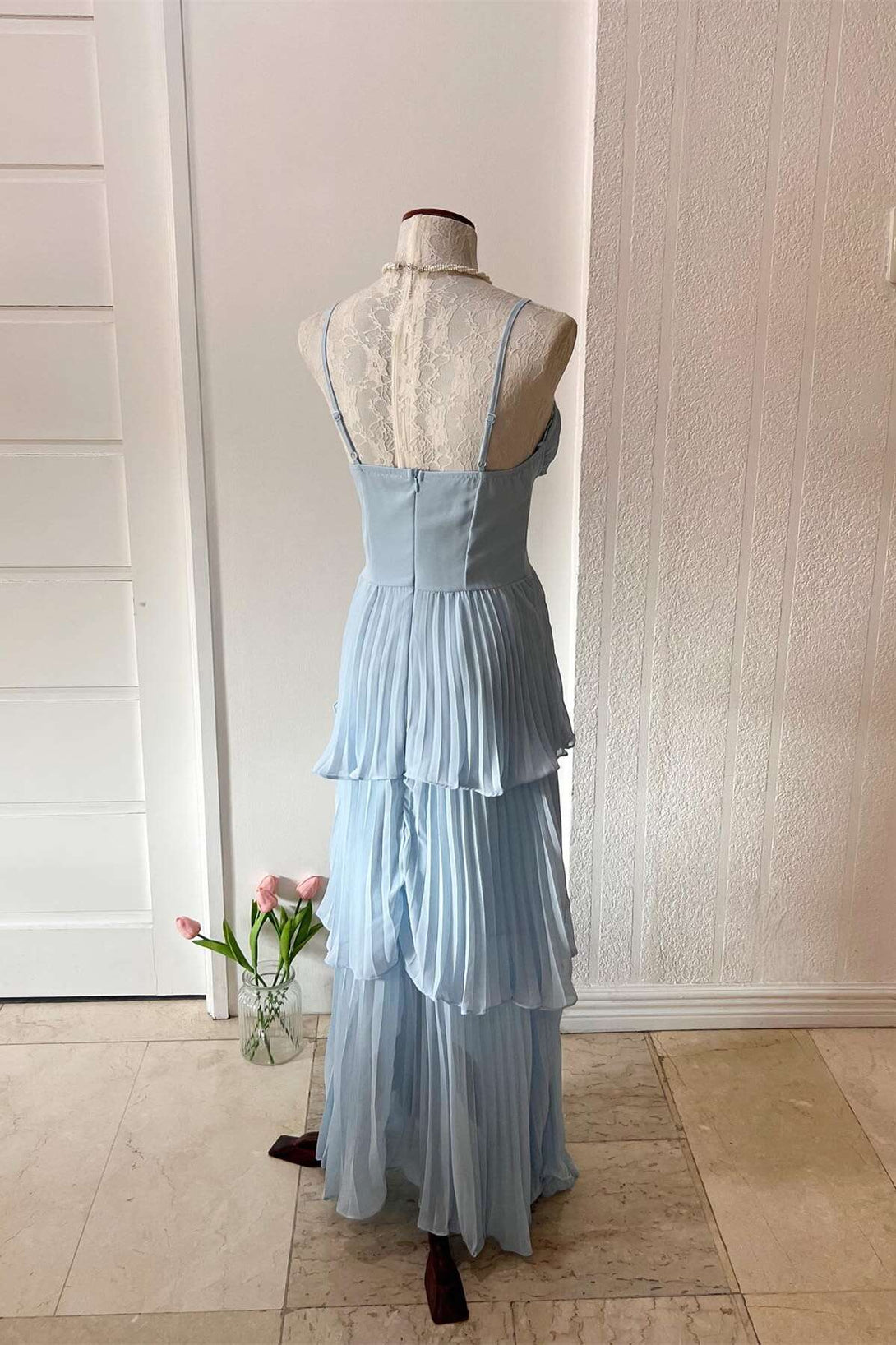 Straps Light Blue Chiffon Pleated Tiered Party Dress