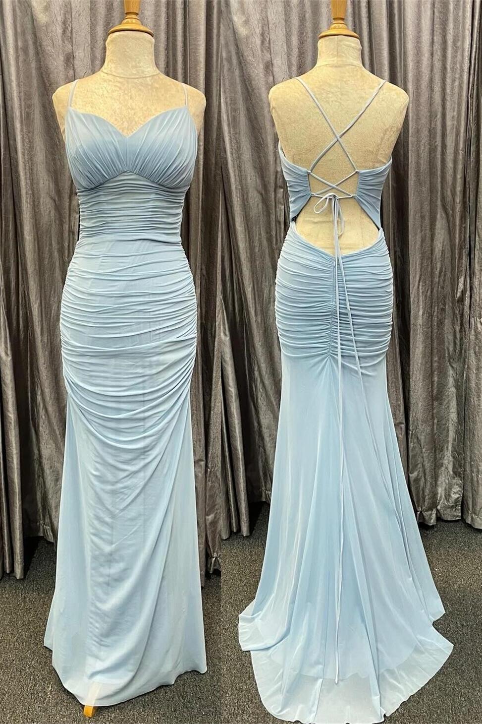 Straps Light Blue Pleated Mermaid Long Prom Dress