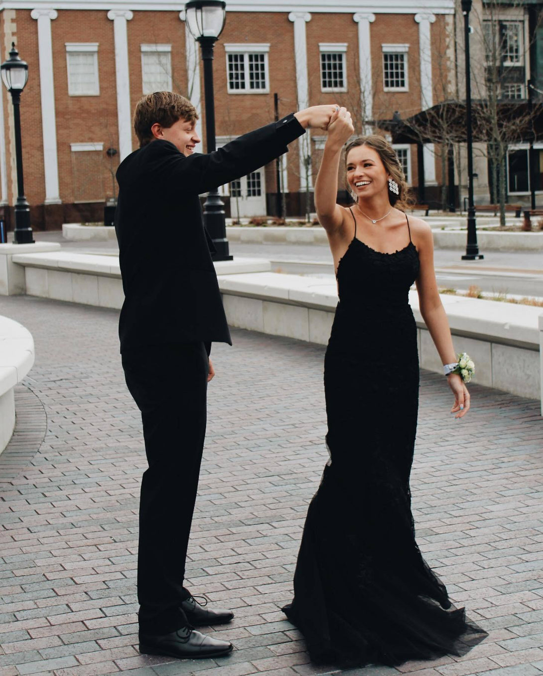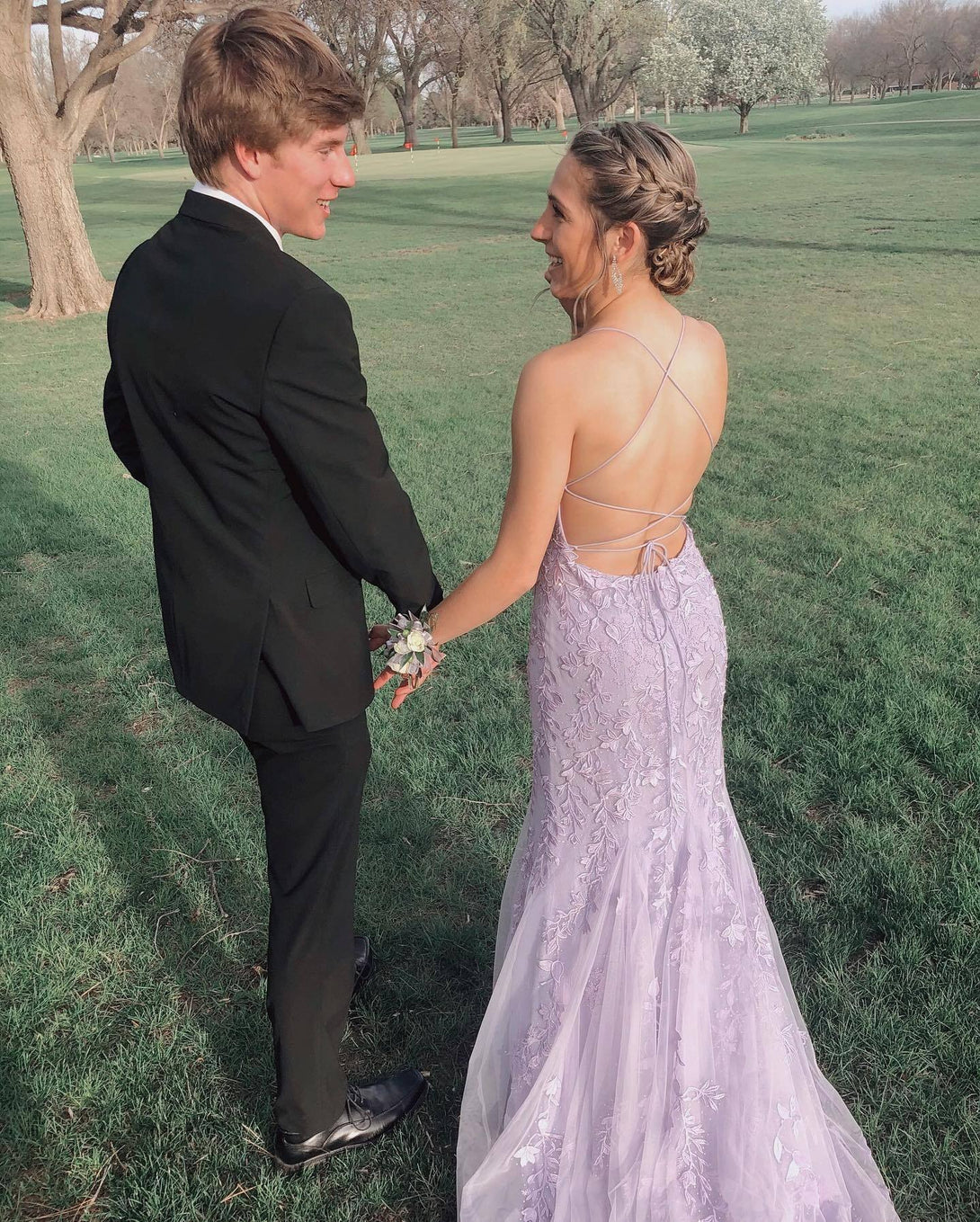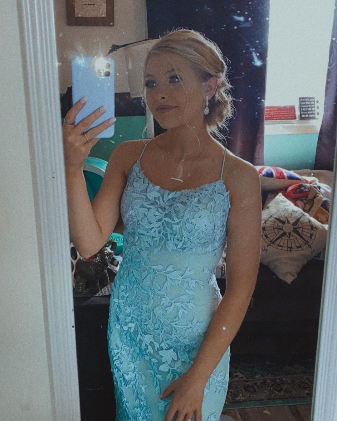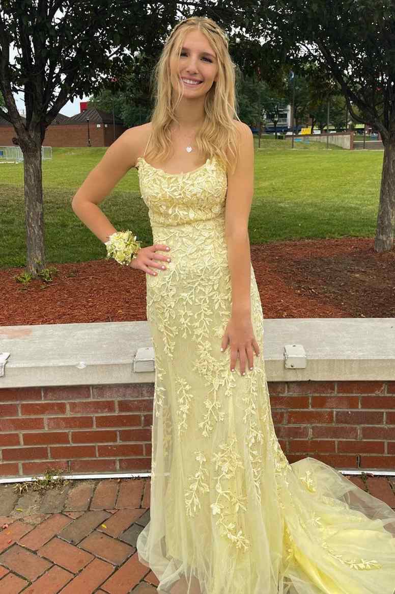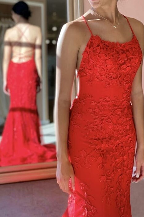 Straps Mermaid Blue Lace Appliqued Long Prom Dress