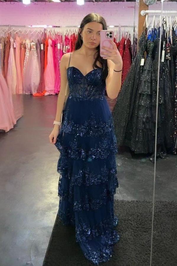 Straps Navy Blue Appliques Tulle Tiered Dress with Slit
