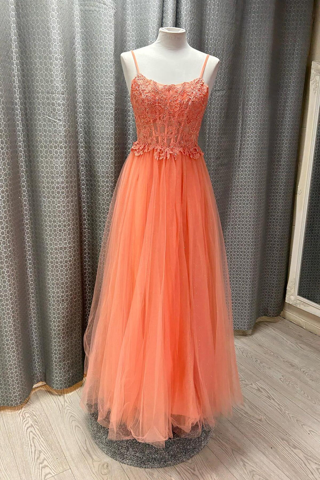 Straps Orange Lace Appliques Tulle Prom Dress