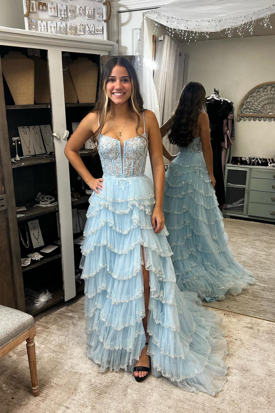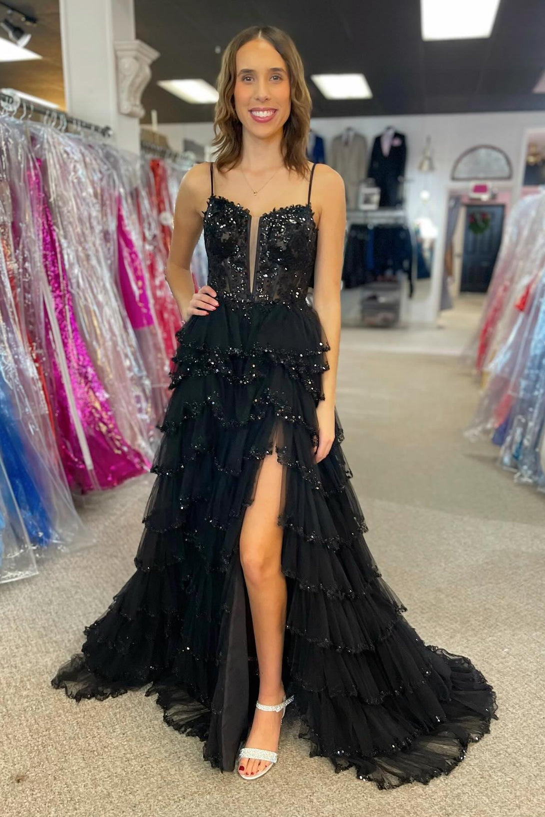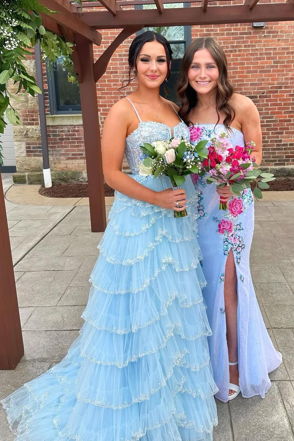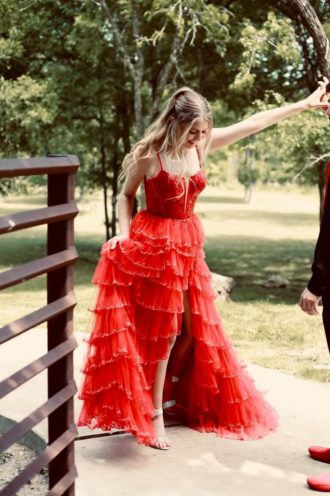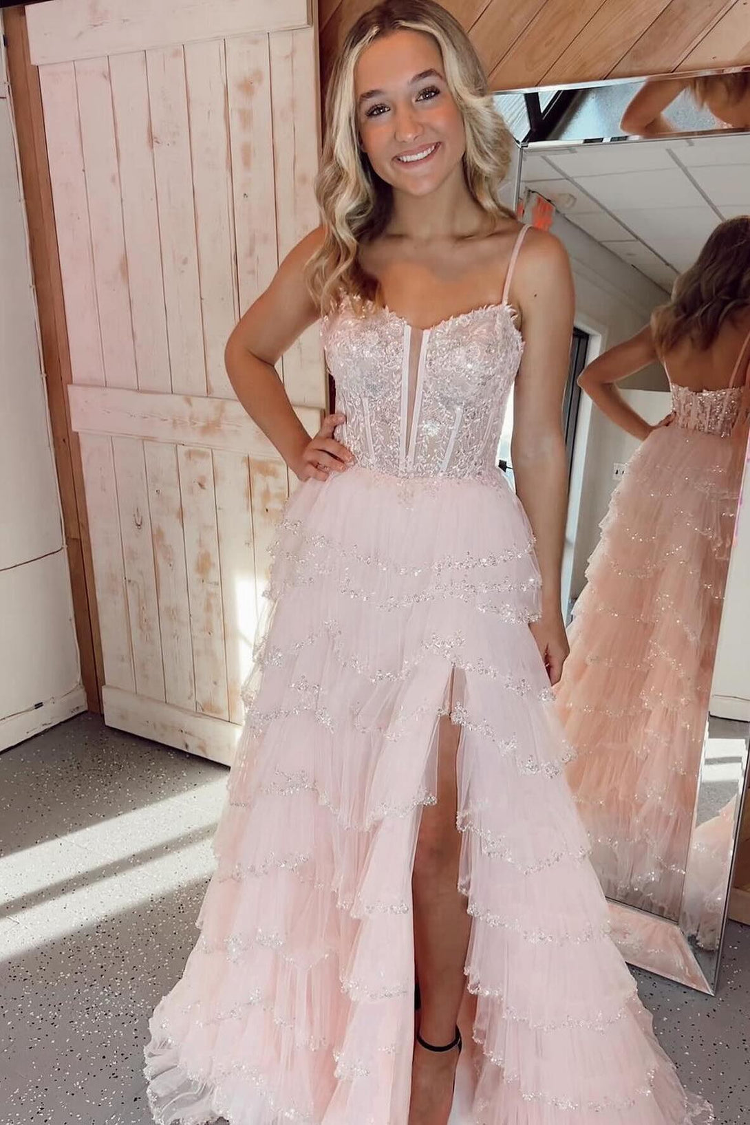 Straps Pink Appliques and Tulle Ruffles Prom Dress