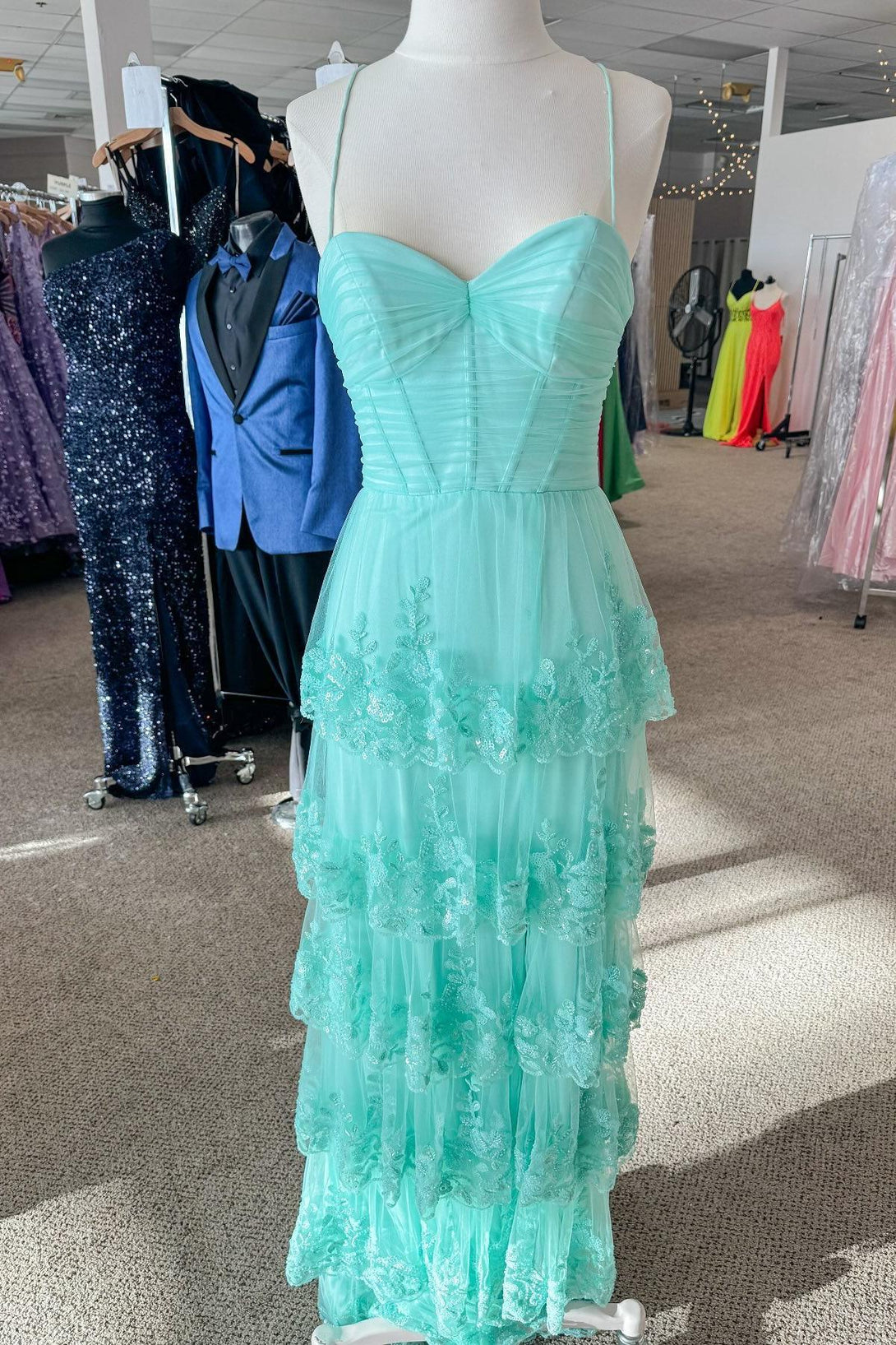 Straps Pink Appliques Tiered Ruffles Long Party Dress