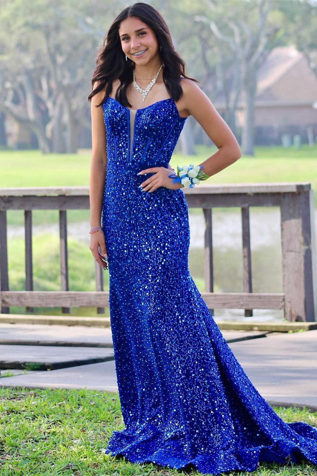 Straps Royal Blue Sequin Mermaid Long Formal Dress with Slit