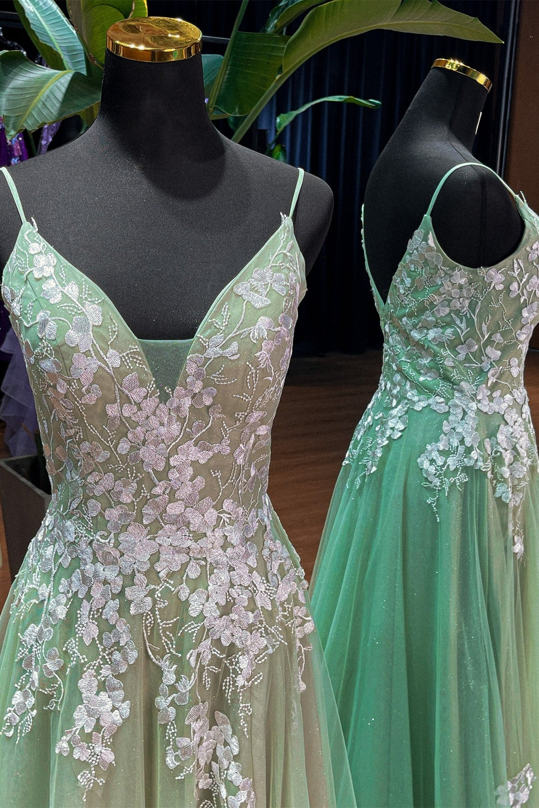 Straps Sage Green Tulle and White Appliques Formal Dress