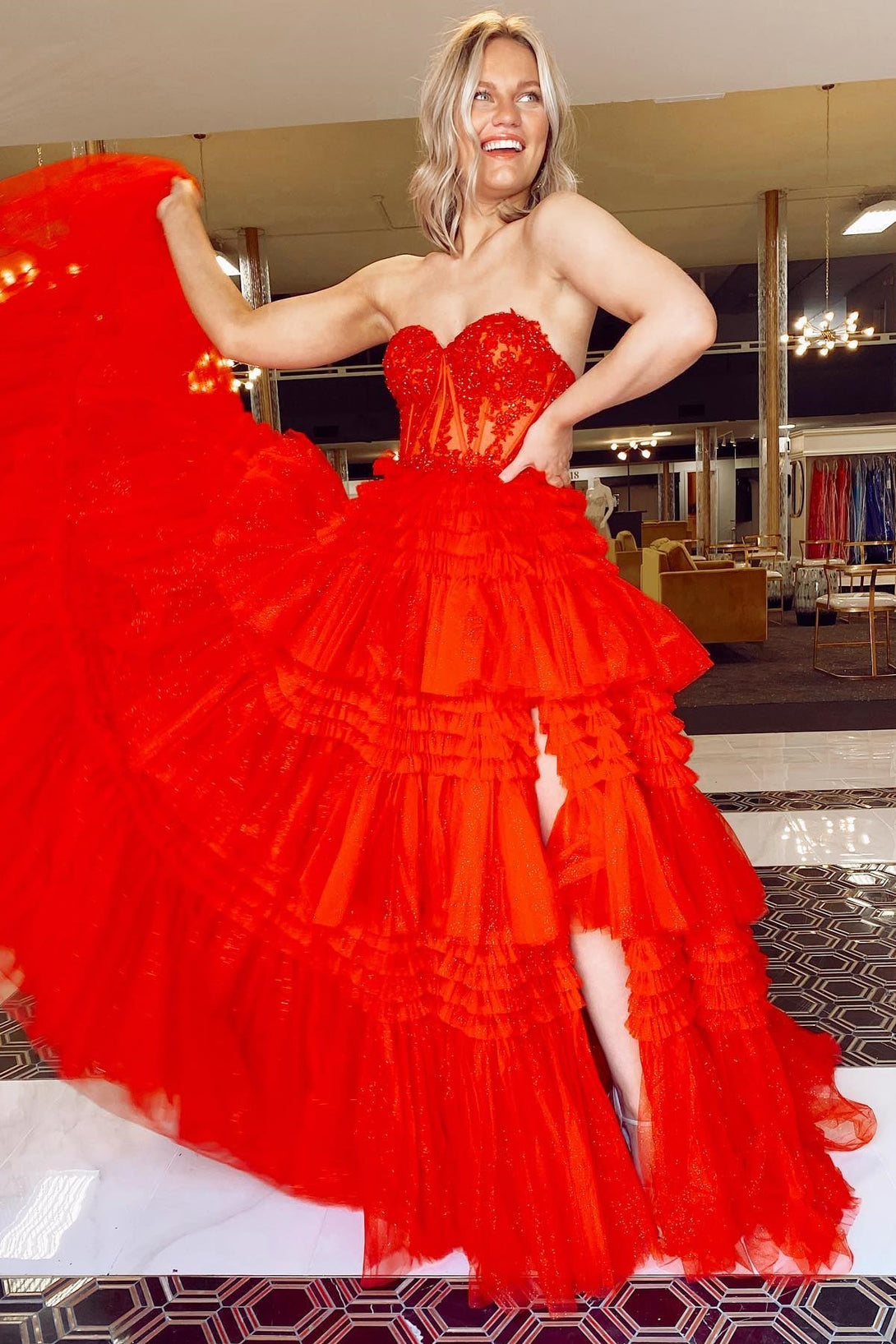 Sweetheart Lace and Tiered Ruffle Long Prom Dress