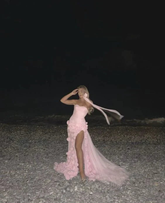 Sweetheart Pink Floral 3D Flowers Evening Prom Dresses With Side Slit