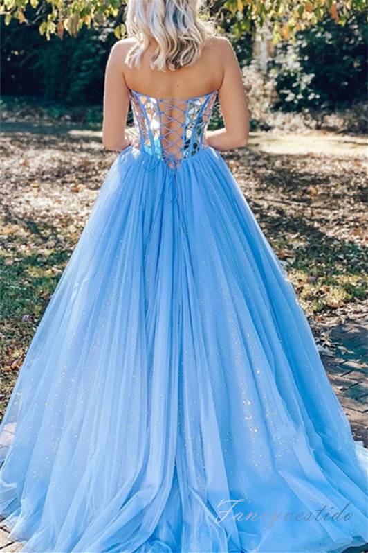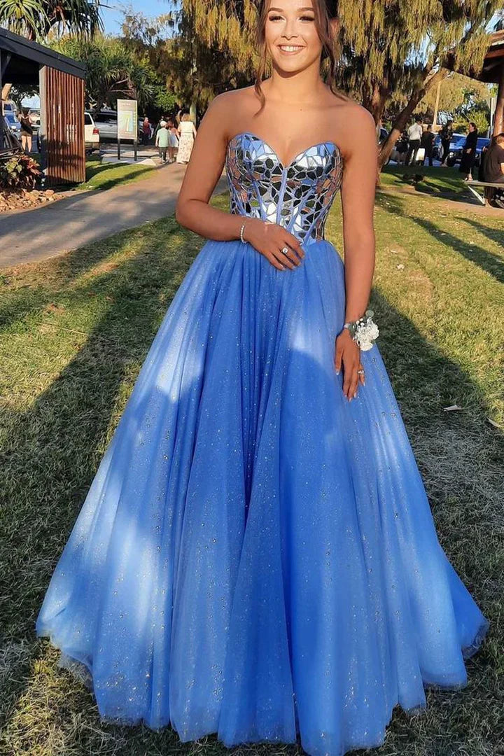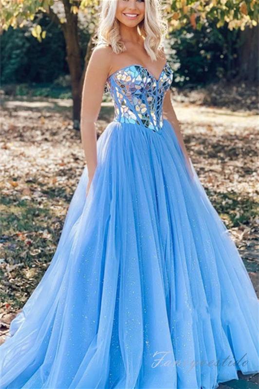 Sweetheart Sky Blue Mirror Sequin A-Line Prom Dress,SSR1192
