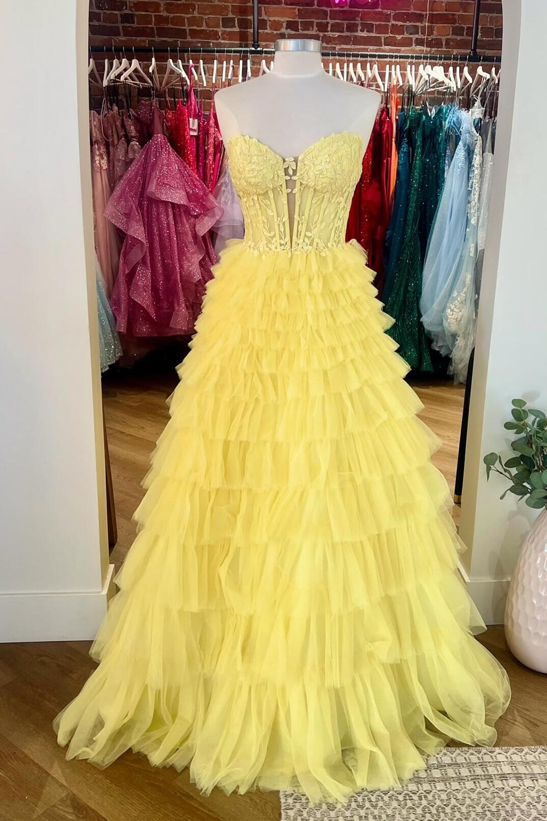 Sweetheart Yellow Lace and Tulle Tiered Formal Dress