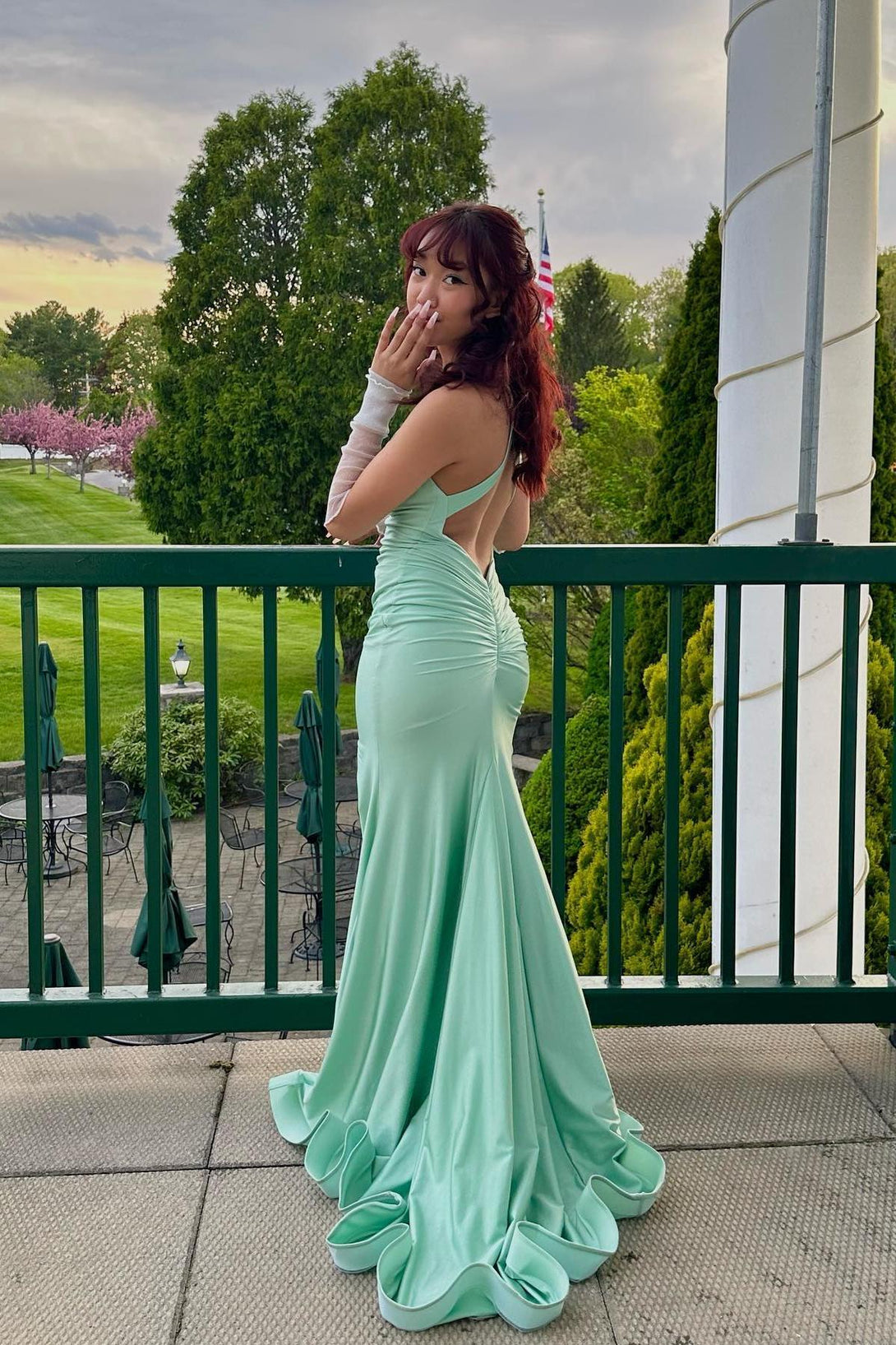 V Neck Green Satin Mermaid Long Prom Dress with Cross Back