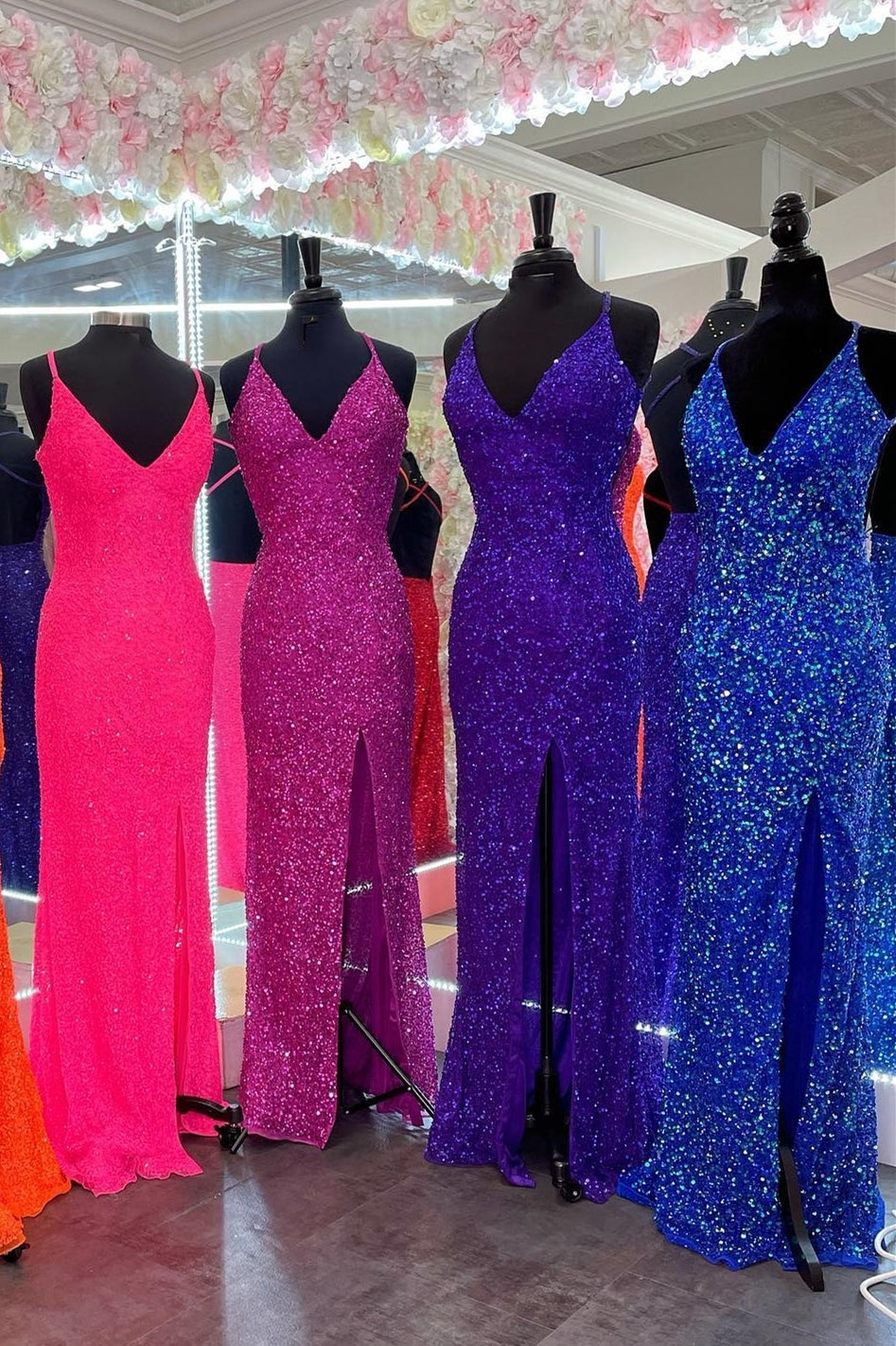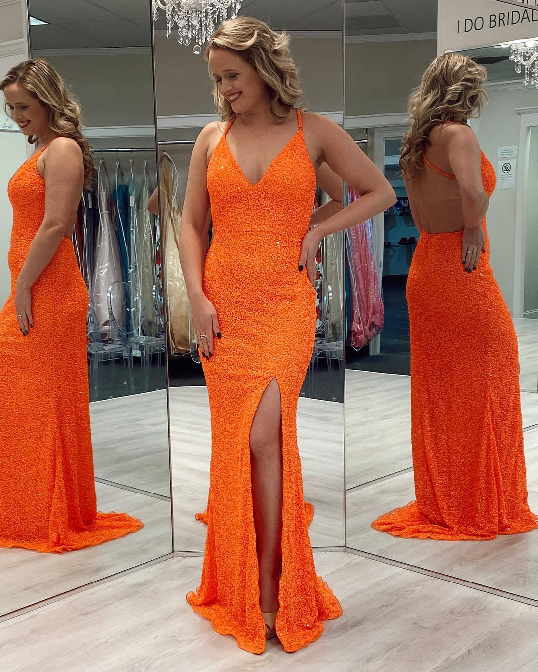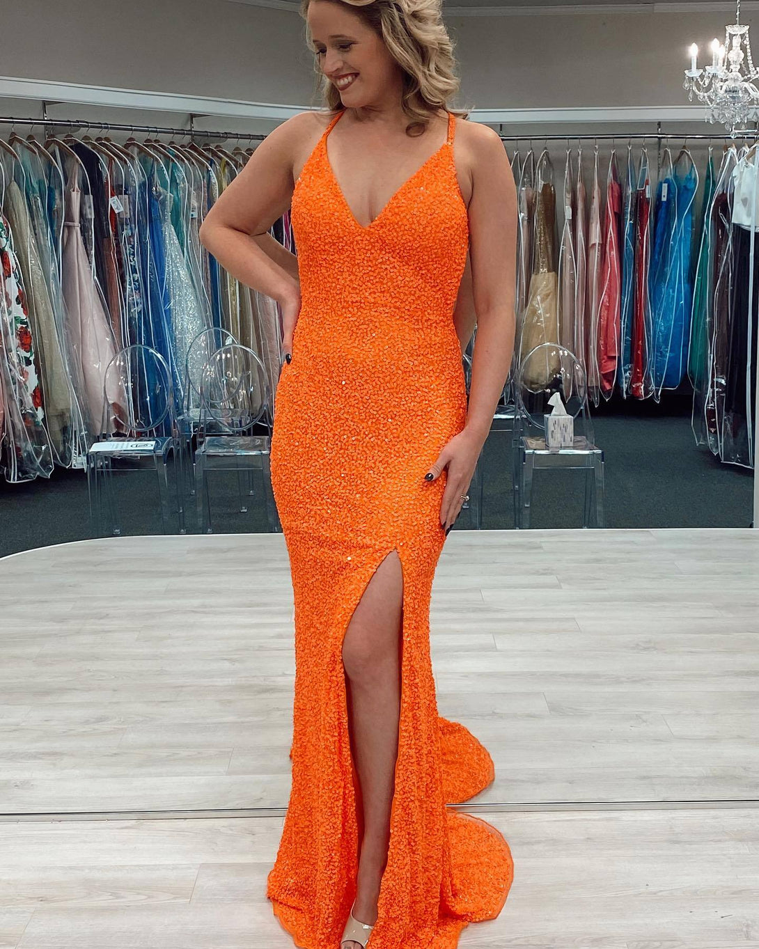 V Neck Sequins Mermaid Long Formal Dress with Cross Back
