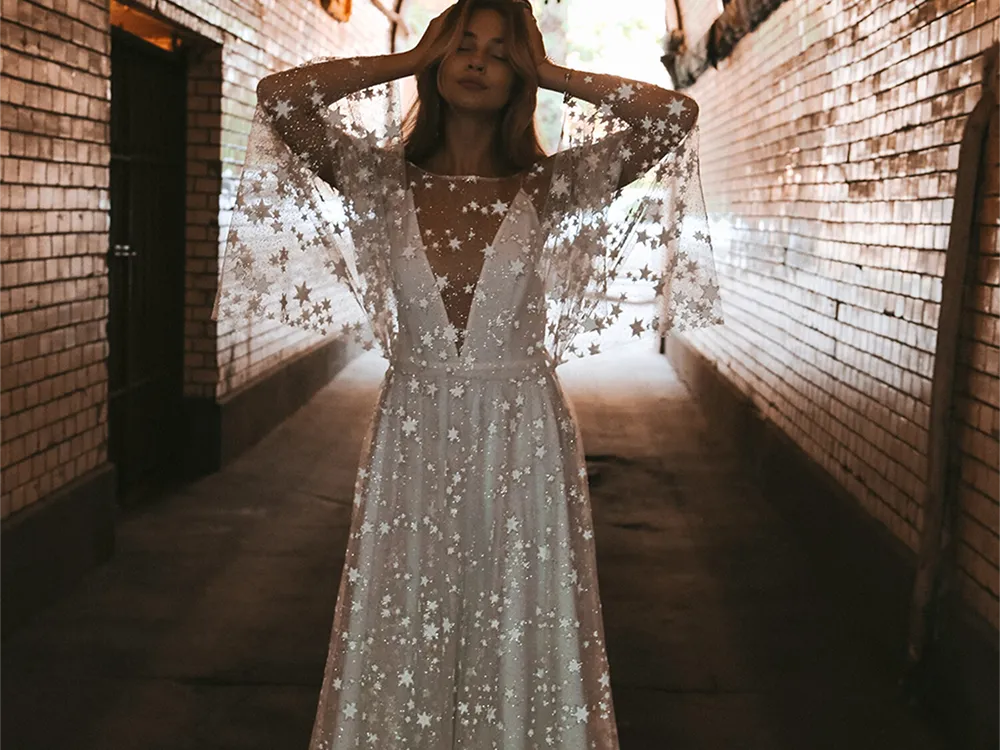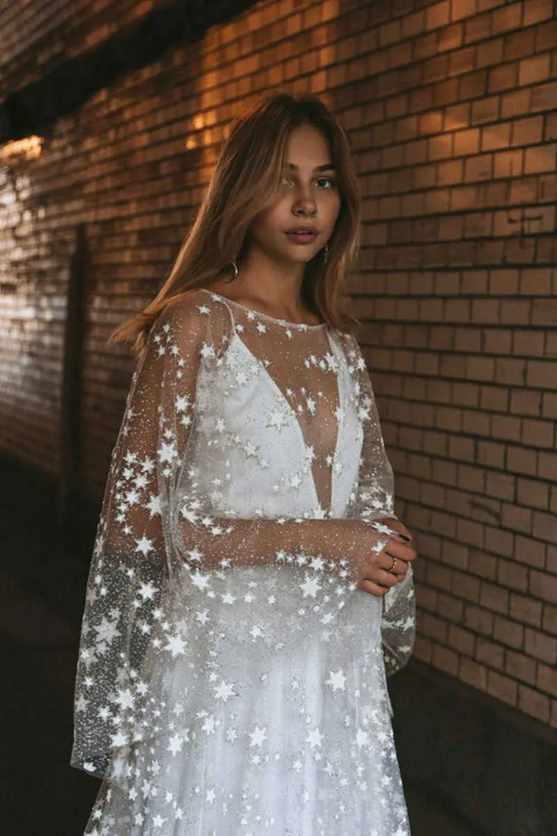 Two Pieces White Starry V-Neck Long Prom Dresses, Evening Party Dress Long