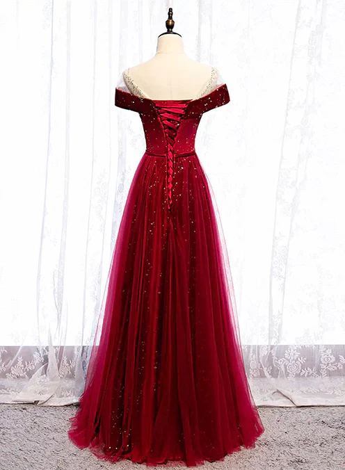 Wine Red Velvet and Tulle Long Prom Dress A-line Floor Length Prom Dress Elegant Evening Dress