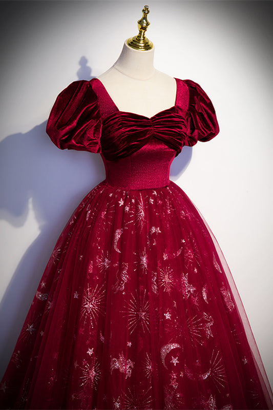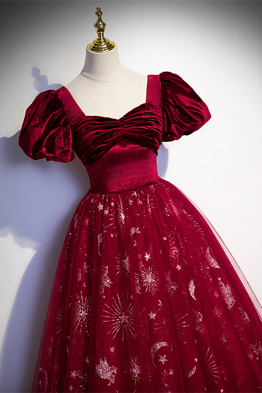 Wine Red Velvet and Tulle Short Sleeves Princess Dress